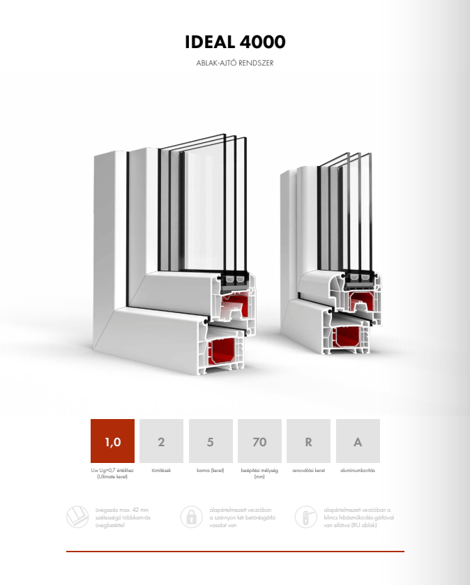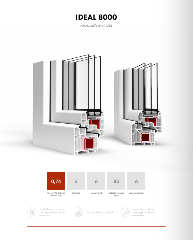 Üveg • kétkamrás üvegkészlet Ug = 0,5 W/m²K, 4/18/4/18/4, • más típusú üveg felhasználási lehetőség: katedrális, fényvédő, biztonsági, betörés elleni, hangszigetelő 52 mm szélességig. Tömítések • TPE tömítések, nagy ellenállóképességgel rendelkeznek a időjárás hatásaival szemben. Kivitelezési lehetőségek • állandó vagy mozgó oszlop aszimmetrikus kilinccsel • bejárati ajtó, erkély ajtó, PSK ajtó • klasszikus ablak, különböző alakú ablak: íves, háromszög, trapéz, kör stb. • Legújabb generációs ablakok. Választásuk egyet jelent a meleggel, csenddel és szép esztétikával. Az Ideal 8000 rendszeren alapuló ablakok magas fokú hőszigetelést és hangszigetelést biztosítanak. Az Ideal 8000 rendszeren alapuló ablakok 6 betörésgátló vasalattal vannak ellátva, amelyek a betörést megnehezítő speciális, állítható csőpántból és csapokból állnak. Az Ideal 8000 a kínálatunkban szereplő legmelegebb Ideal rendszer, amely lehetőségek tárházát nyújtja. Beépítési mélysége lehetővé teszi akár 52 mm szélességű üvegezés alkalmazását is. A legmagasabb minőség, a kellemes hőérzet és az akusztikai kényelem ötvözetét értékelő ügyfeleknek szélesebb, akár négyrétegű üvegezés alkalmazását ajánljuk, biztosítva ezzel az épületen belül is az ideális körülményeket. Ez a rendszer még a legmagasabb, negyedik osztályú légáteresztőképességre és a 8A vízszigetelési osztályra vonatkozó szabványoknak is megfelel.