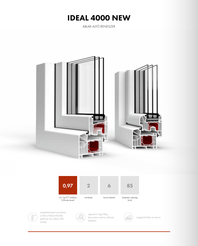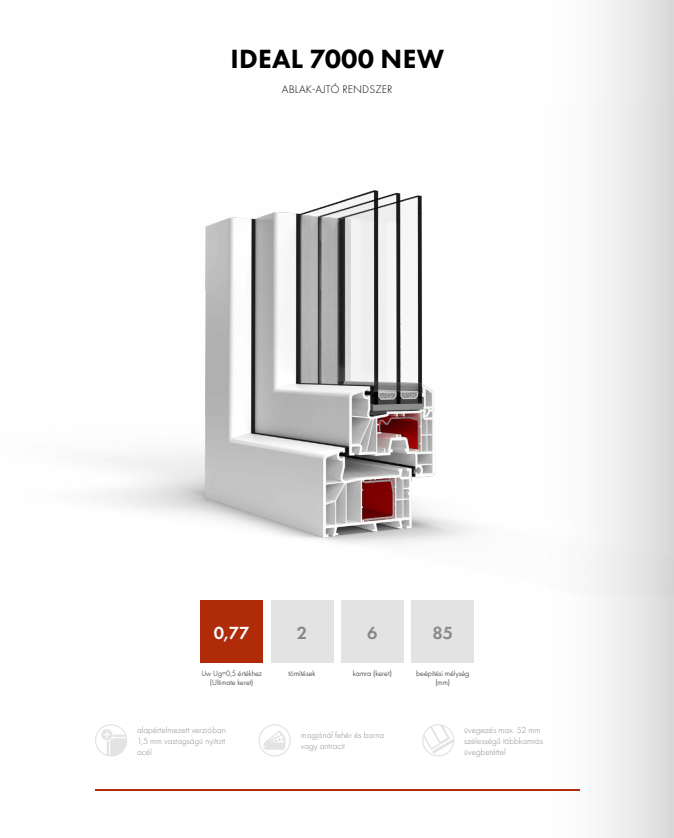 Profil• nagy középső erősített kamra az optimális statikai paramétereket biztosítja. 6 légkamrás profil rendszer, 85mm-es tok szélességgel • 2 Tömítéses rendszer • a szolid profil az ablak nagyobb stabilitását és tartósságát garantálják• kiváló hő és hangszigetelés • a profil galvanizált acéllal készül, amely merevséget, hibamentes működést és az ablakok változatlan alakját biztosítja, Üveg • egykamrás üvegkészlet Ug = 1,1 W/m²K, 4/16/4/ • más típusú üveg felhasználási lehetőség: katedrális, fényvédő, biztonságos, betörés elleni. Tömítések • TPE (termo plasztikus elasztomér) technológiában gyártott tömítések, nagy ellenállóképességgel rendelkeznek a időjárás hatásaival szemben. Kivitelezési lehetőségek: klasszikus ablakok, állandó vagy mozgó oszlop aszimmetrikus kilinccsel • bejárati ajtó, erkély ajtó, PSK ajtó. Univerzális rendszer, amely modern családi házak, többlakásos épületekés felújítás esetén egyaránt beválik.